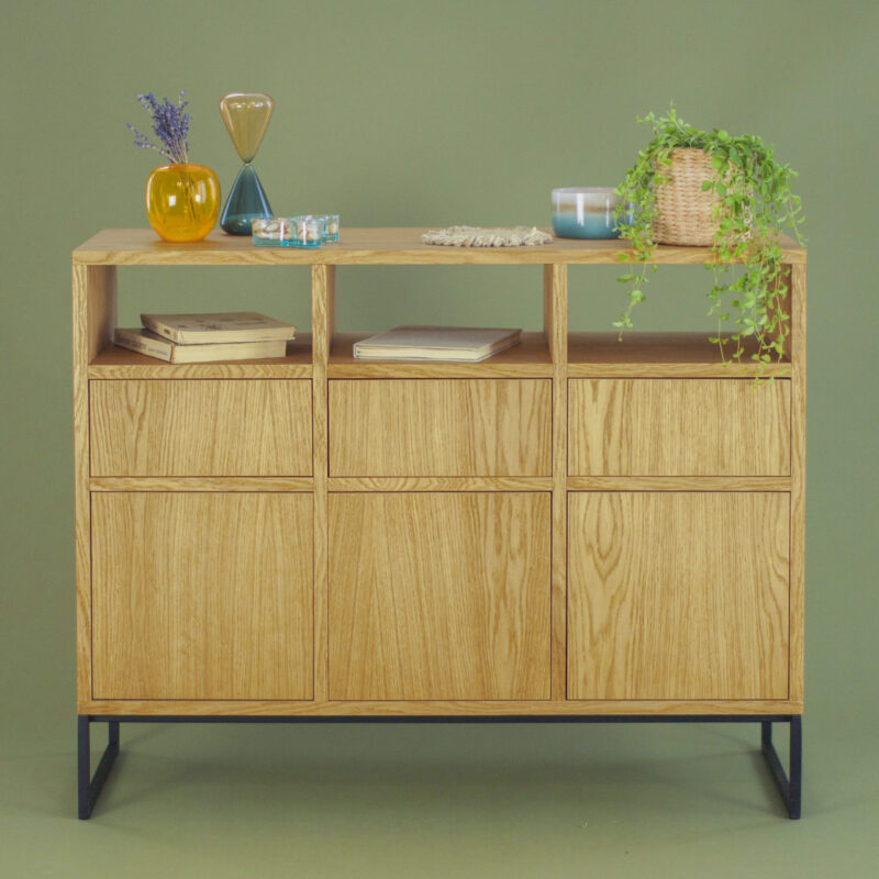 - Dębowa płyta fornirowana wykończona naturalnym olejowoskiem firmy Osmo – nadaje komodzie ciepły, naturalny wygląd, jednocześnie podkreślając jej solidność i trwałość;