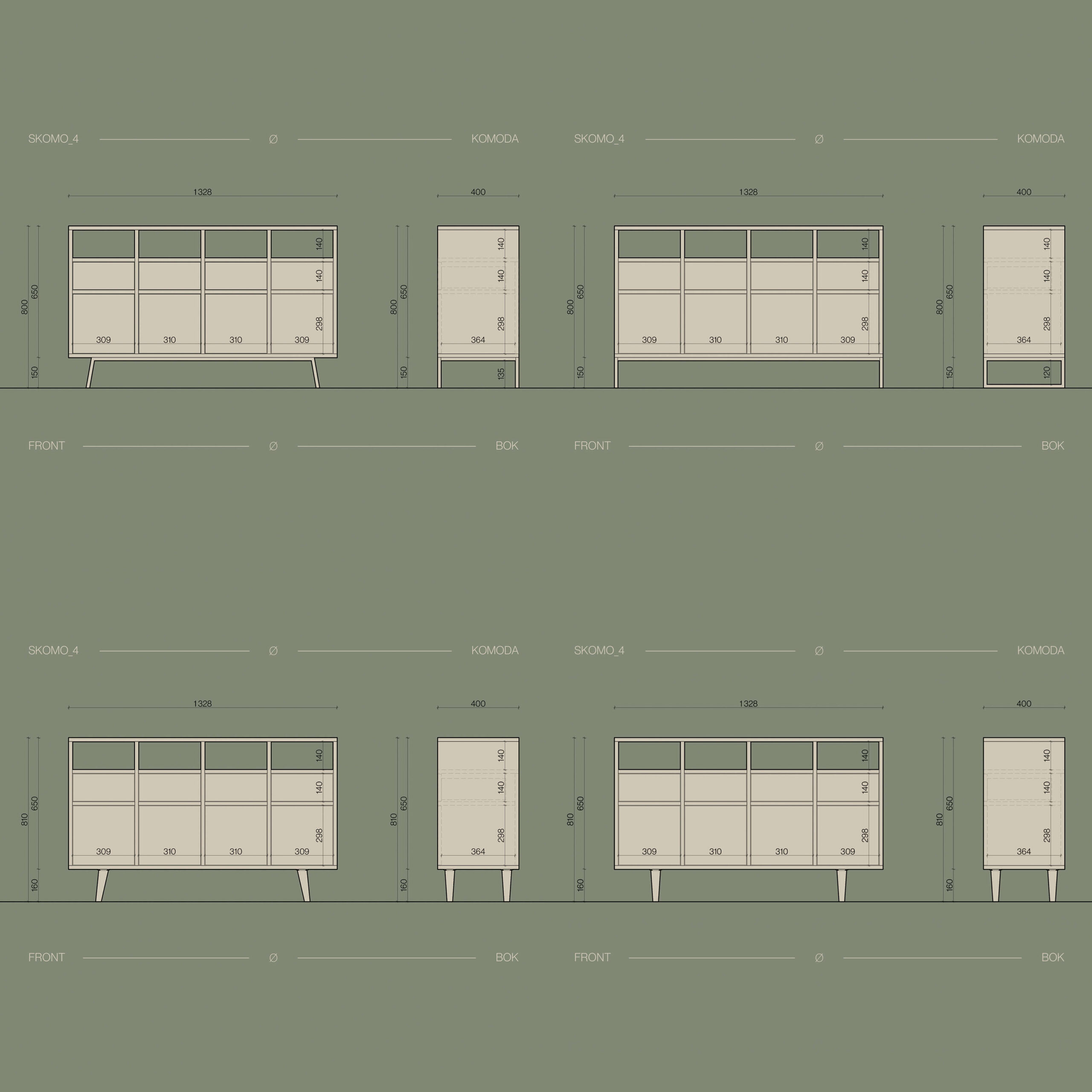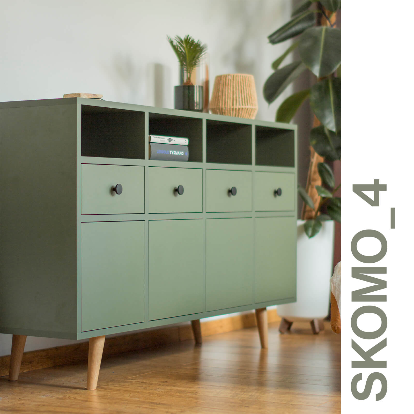 SKOMO to komoda o ponadczasowej formie opartej na systemie modułowym. Każdy moduł składa się z trzech funkcjonalnych elementów: otwartej półki, praktycznej szuflady oraz szafki, co umożliwia zorganizowanie przestrzeni w efektywny sposób. Dodatkowo zastosowanie zawiasów i prowadnic firmy BLUM gwarantuje długowieczność i niezawodność w użytkowaniu.