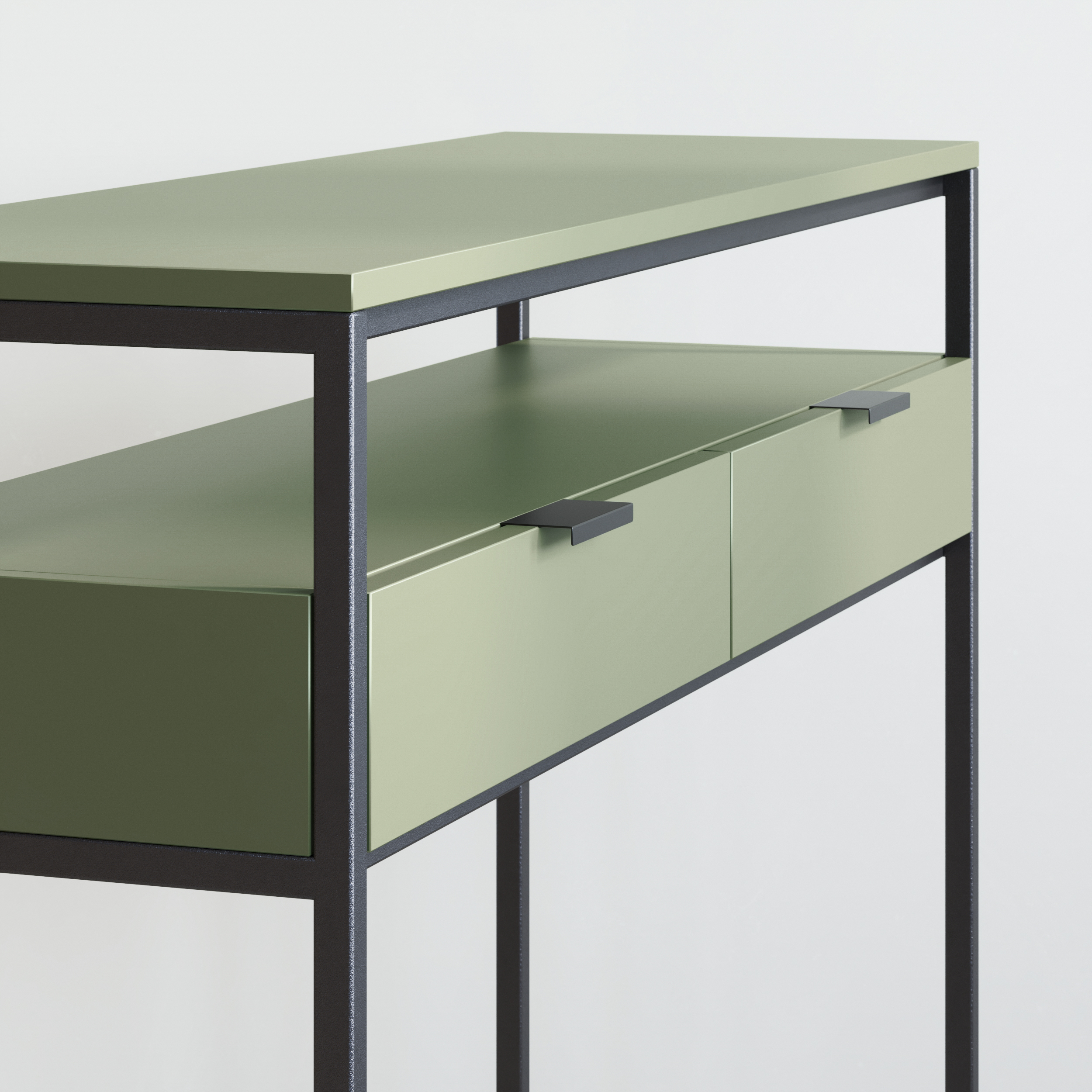 Mebel oparty jest na spawanym stelażu stalowym, który pomalowany jest proszkowo, co zapewnia wyższą odporność na zarysowania. Korpus komody posiada dwie szuflady z wysokiej jakości prowadnicami firmy Blum, które zapewniają długowieczność i doskonałą funkcjonalność.