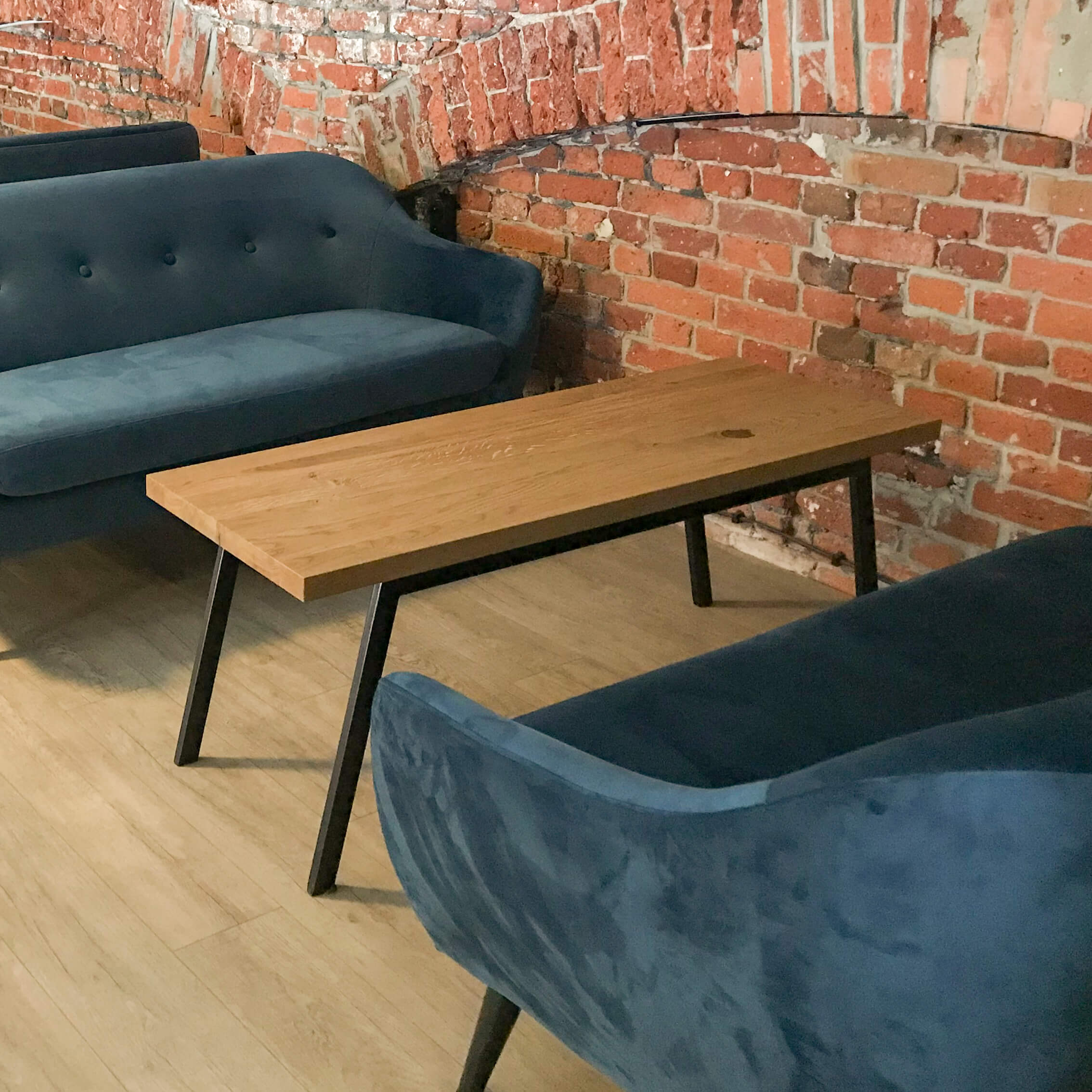 Blat stolika wykonano z litego drewna dębowego, wykończonego twardym woskiem olejnym Osmo, co podkreśla jego naturalną strukturę i zapewnia odporność na codzienne użytkowanie. Całość wspiera spawany stelaż stalowy, malowany proszkowo, gwarantujący stabilność i nowoczesny charakter mebla.