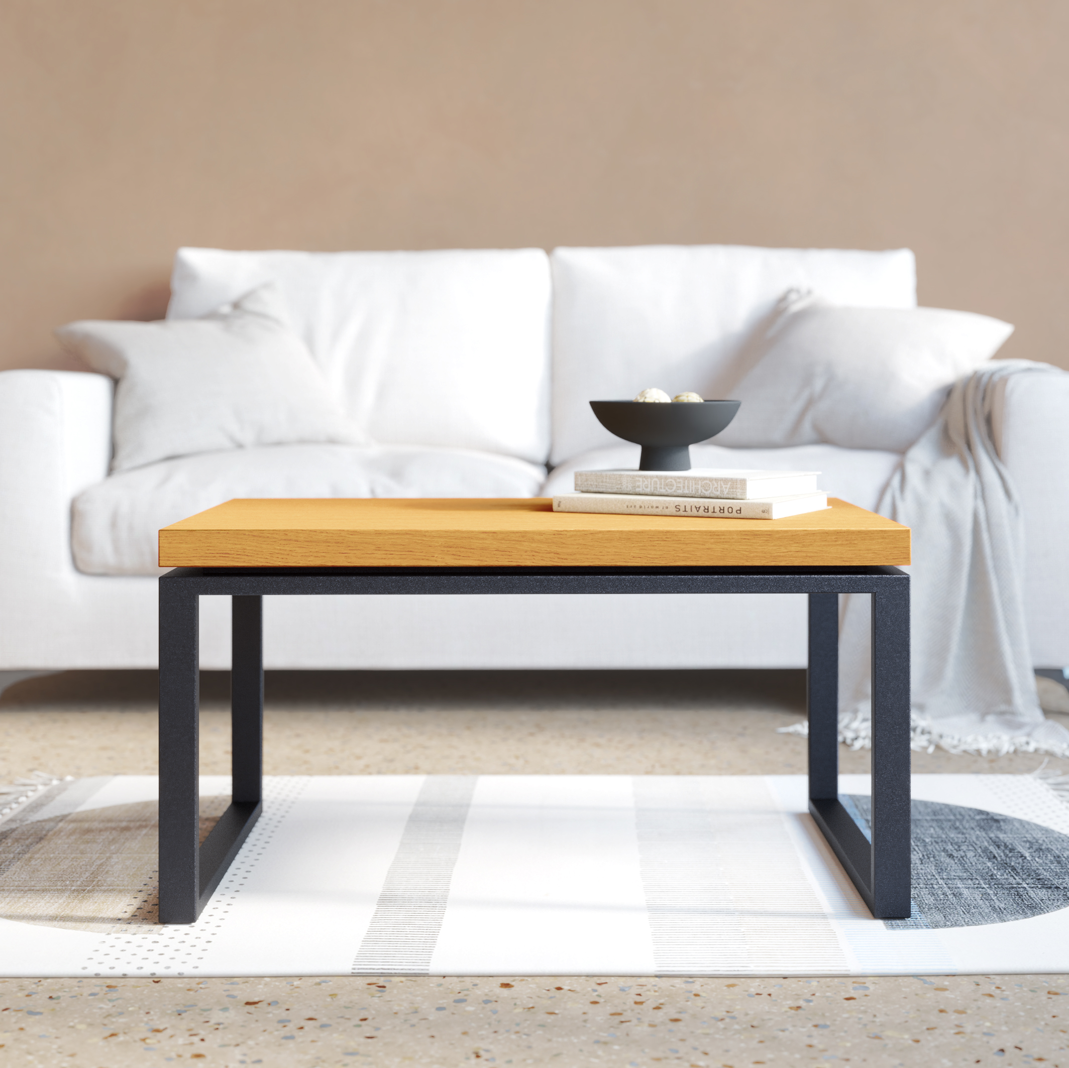 Wykonany jest z wysokiej jakości materiałów. Stelaż stolika jest malowany proszkowo, co gwarantuje trwałość i odporność na uszkodzenia, natomiast blat pokryty jest fornirem dębowym wykończonym olejowoskiem firmy OSMO. Eleganckie wykończenie w połączeniu z nowoczesnym stylem sprawia, że stolik staje się nie tylko praktycznym dodatkiem, ale również atrakcyjnym elementem dekoracyjnym.