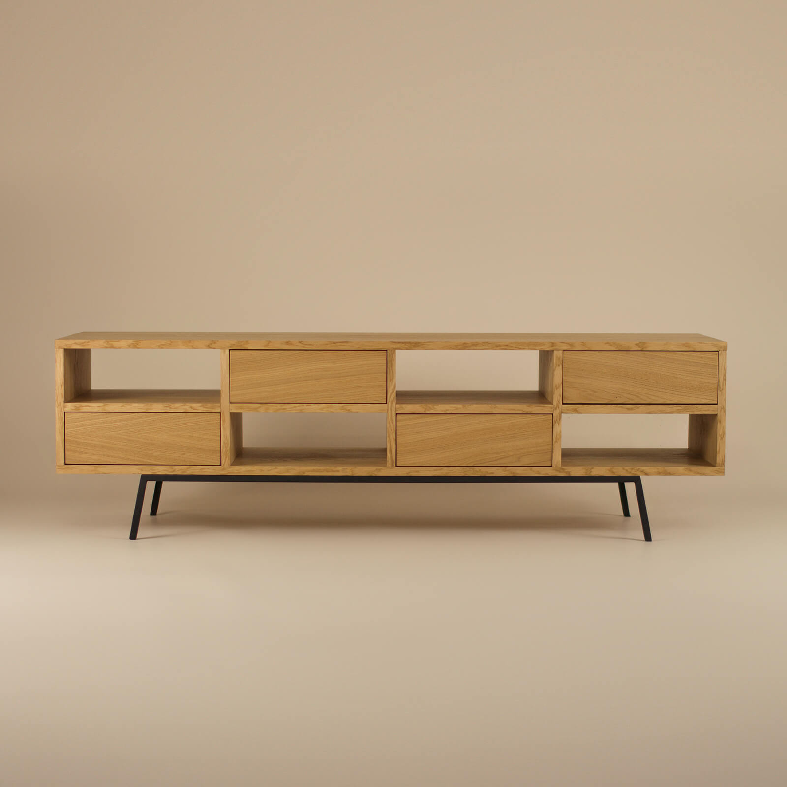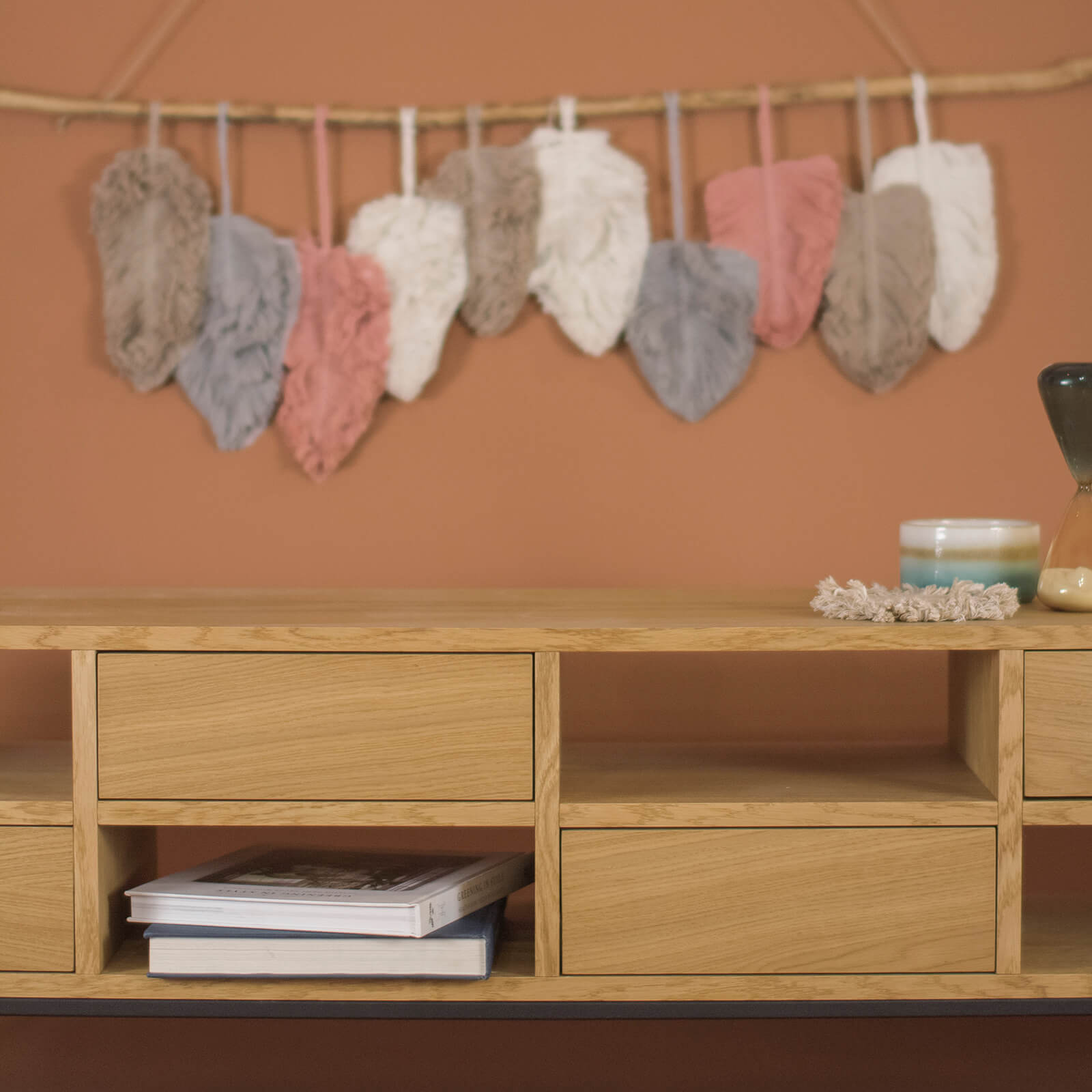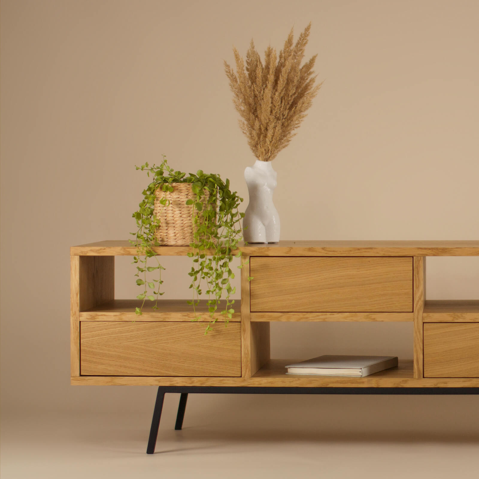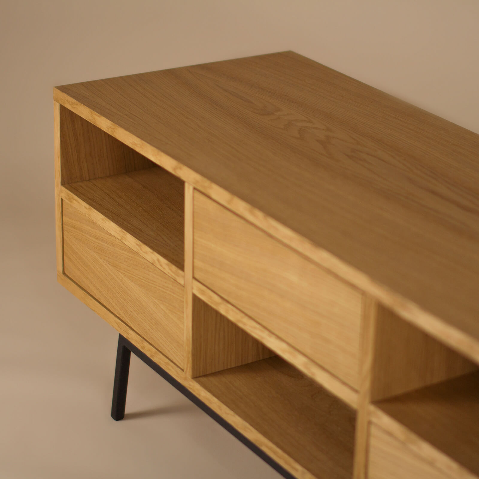 • Dębowa płyta fornirowana wykończona naturalnym olejowoskiem firmy Osmo – nadaje komodzie ciepły, naturalny wygląd, jednocześnie podkreślając jej solidność i trwałość;
